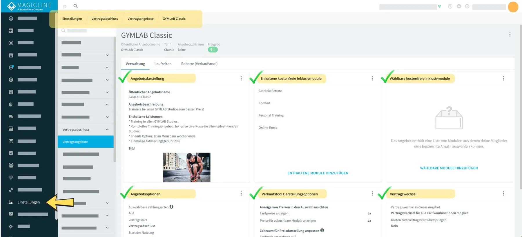 Wie du schon von den bereits vorgestellten Features kennst, stehen dir auch für die Darstellung deiner Verträge diverse Individualisierungsmöglichkeiten zur Verfügung. Neben den klassischen Informationen, wie Preis, Vertragslaufzeit und Zahlungsintervall kannst du beispielsweise Angebotszeiträume festlegen, buchbare Module definieren (Personal Training, Körpermessungen, etc.) oder eine Aktivierungsgebühr hinzufügen.