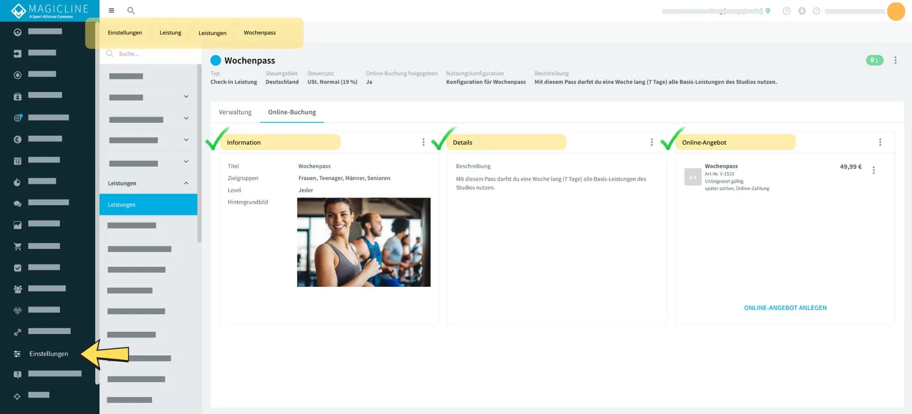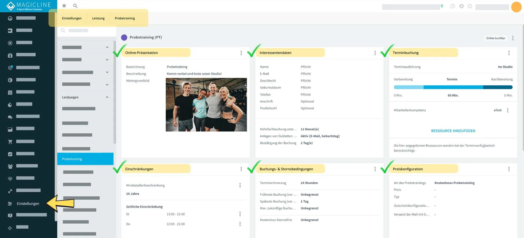 Eine Möglichkeit, diese Zielgruppe anzusprechen, sind Probetrainings, die du innerhalb der MySports Website zur Online-Buchung anbieten kannst. Die Konfiguration erfolgt in deiner Magicline. Lege fest, wie dein Probetraining dargestellt werden soll: Hinterlege ein ansprechendes Bild und präsentiere dein Studio entsprechend deiner Philosophie. Zusätzlich kannst du konfigurieren, welche Daten deine Interessenten angeben sollen, um ein Probetraining bei dir zu absolvieren.