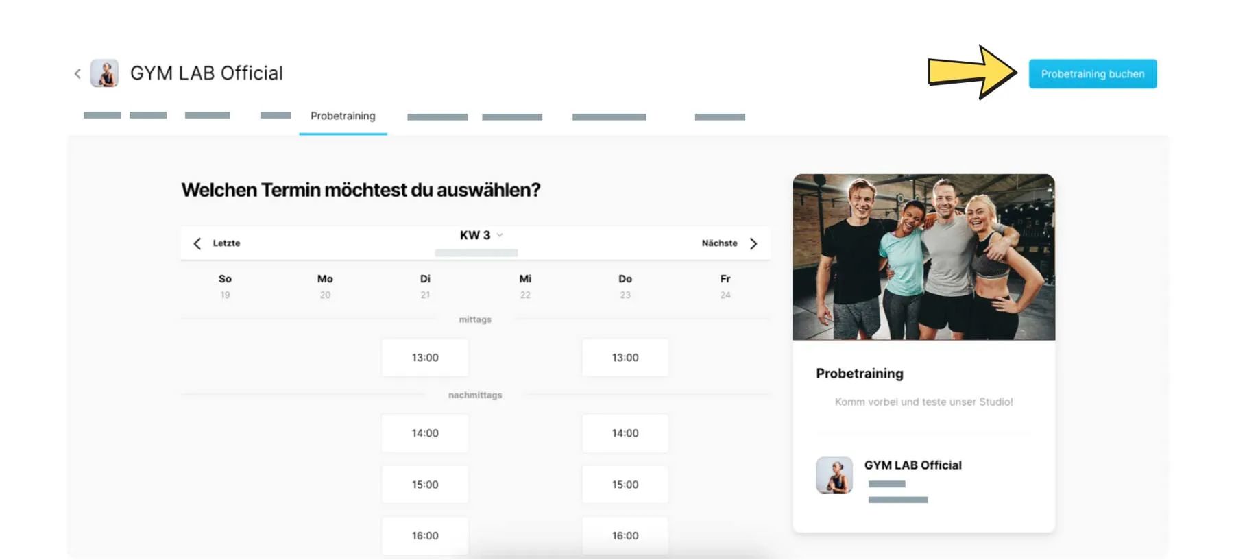 Nachdem du dein Probetraining konfiguriert hast und du es online buchbar gemacht hast, wird es deinen Interessenten direkt auf der MySports Website angezeigt.