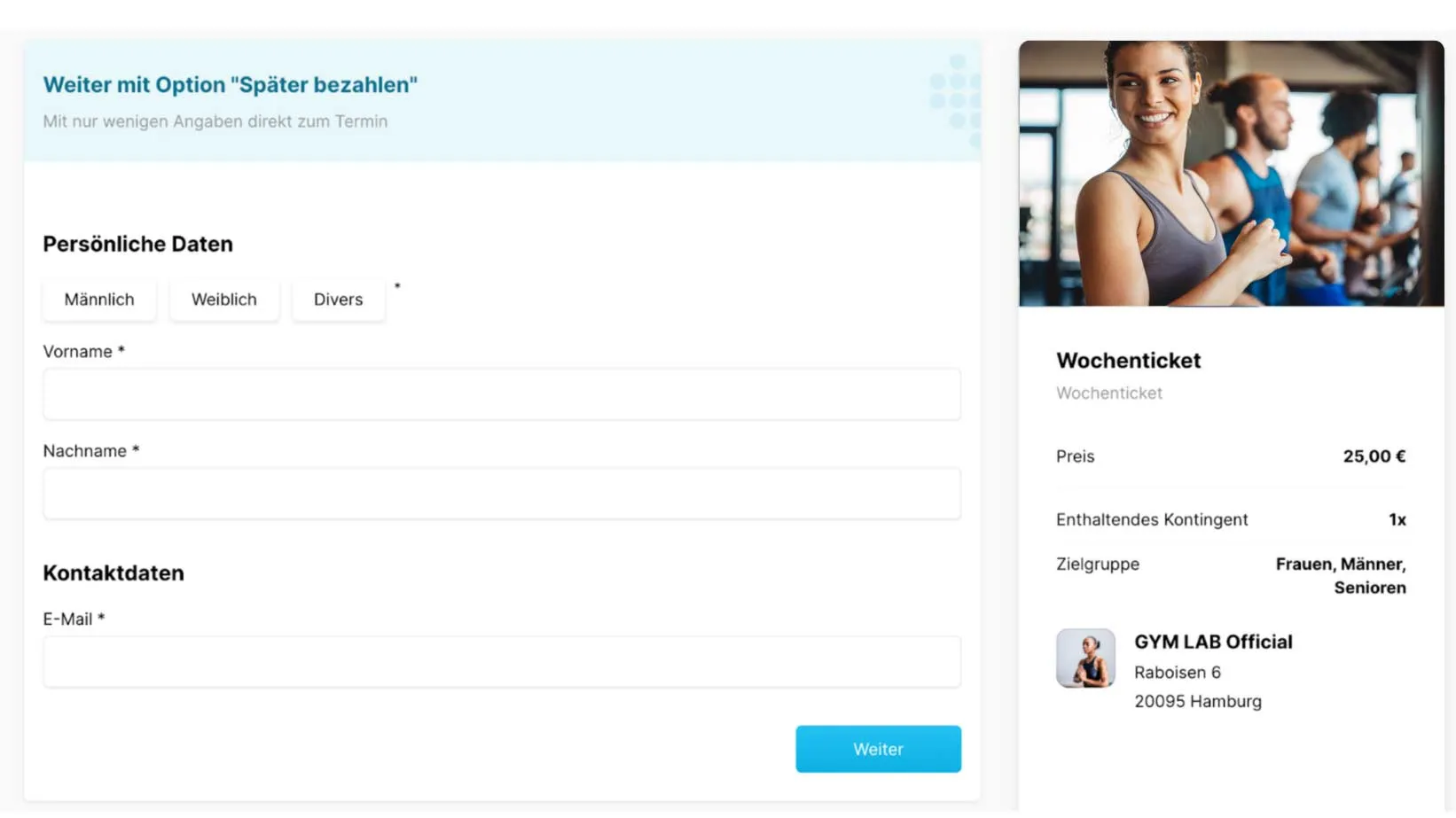 Diese Daten können hinterher für Folgegespräche, Feedback und individuelle Vertragsangebote genutzt werden. Definiere, in welchen Zeiträumen und wie oft Probetrainings stattfinden dürfen und füge Trainer hinzu, die sie begleiten sollen. Selbstverständlich bestimmst nur du, ob dein Probetraining kostenlos oder kostenpflichtig angeboten werden soll. Viele Gestaltungsoptionen machen dein Angebot individuell und maßgeschneidert auf dein Studio- und Betreuungskonzept.